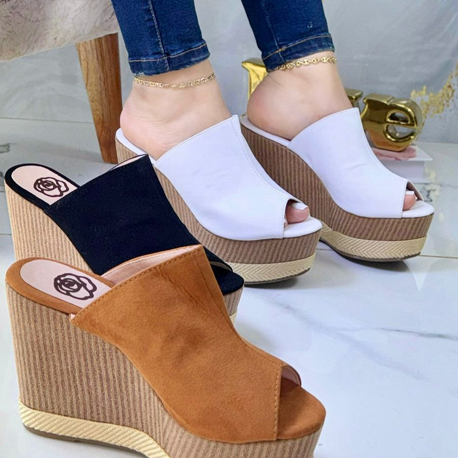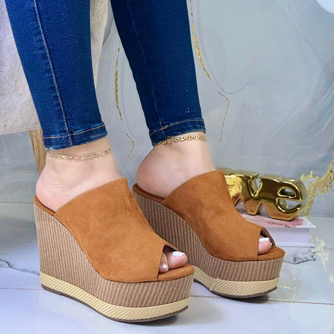 Esta plataforma destaca por su diseño versátil y cómodo. Su capellada en material tipo lince suave brinda una textura delicada y agradable al tacto, mientras la suela forrada en tela con simulación de corcho aporta un look fresco y moderno, ideal para los días soleados.
