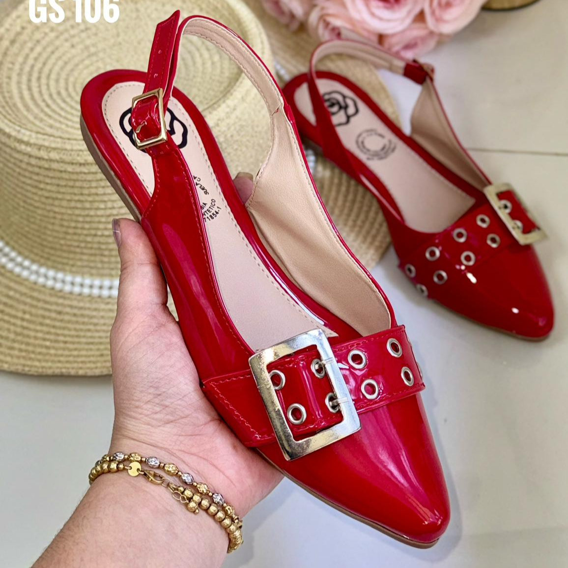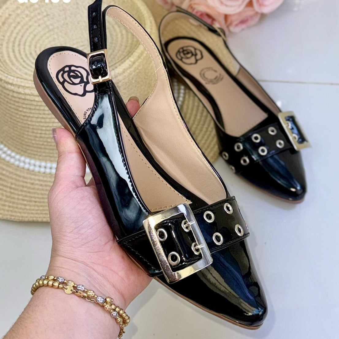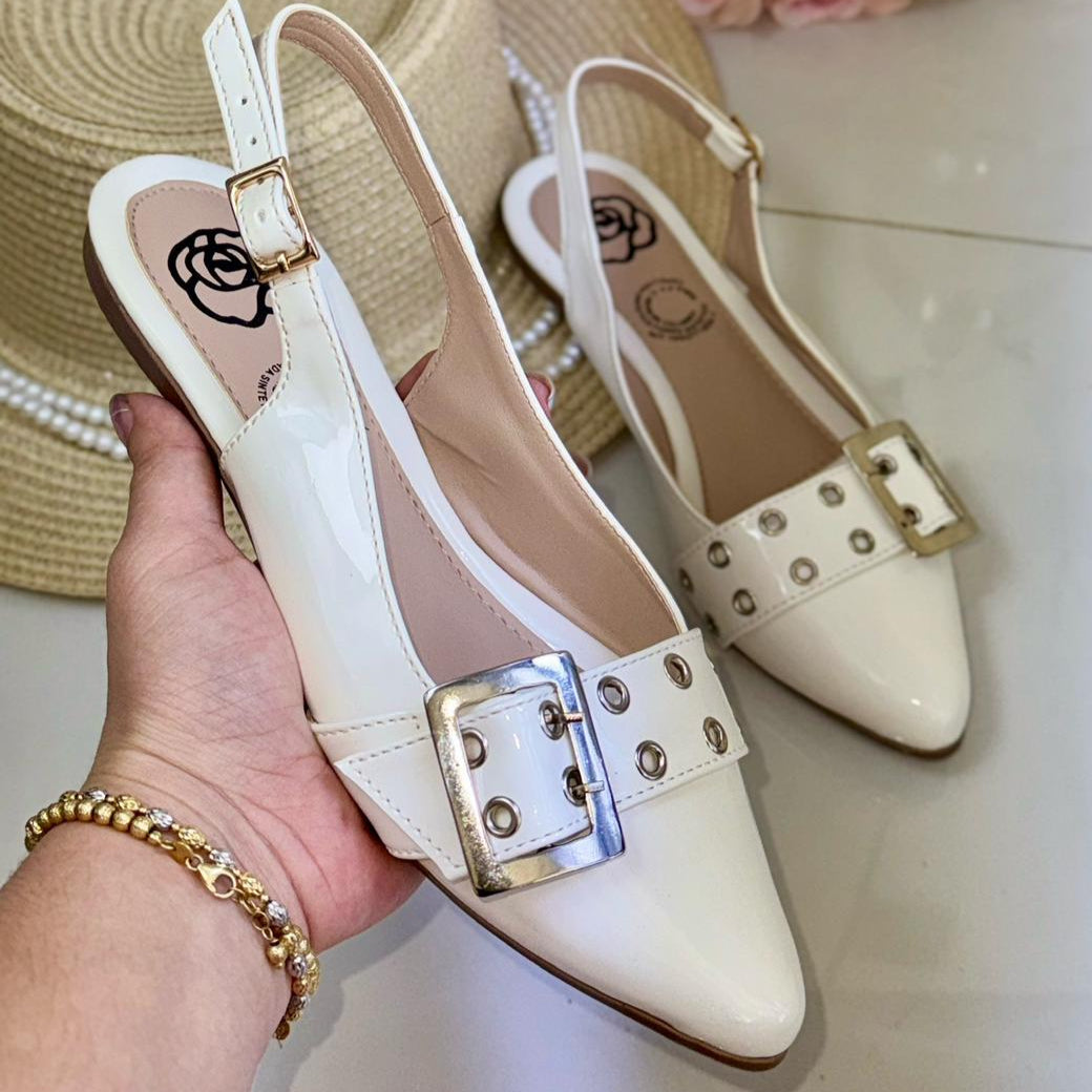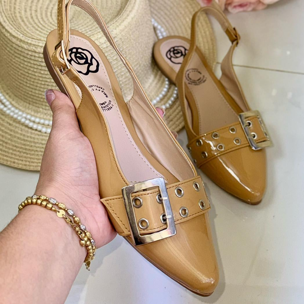 Esta baleta de punta semiredonda en charol combina brillo elegante con detalles funcionales. Los ojales decorativos y la hebilla en acero inoxidable aportan carácter y estilo, perfectos para un look sofisticado y actual.